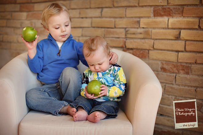 Do you remember the infamous fur coat? This is what was inside! Rory's first taste of sugar! The result! I love Jackson's little giggle face here: J&R's mom rocked it out with clothing choices... she also brought along these apples for the kids to munch on which ended up being great props. Their eyes are to die for! Cuteness!